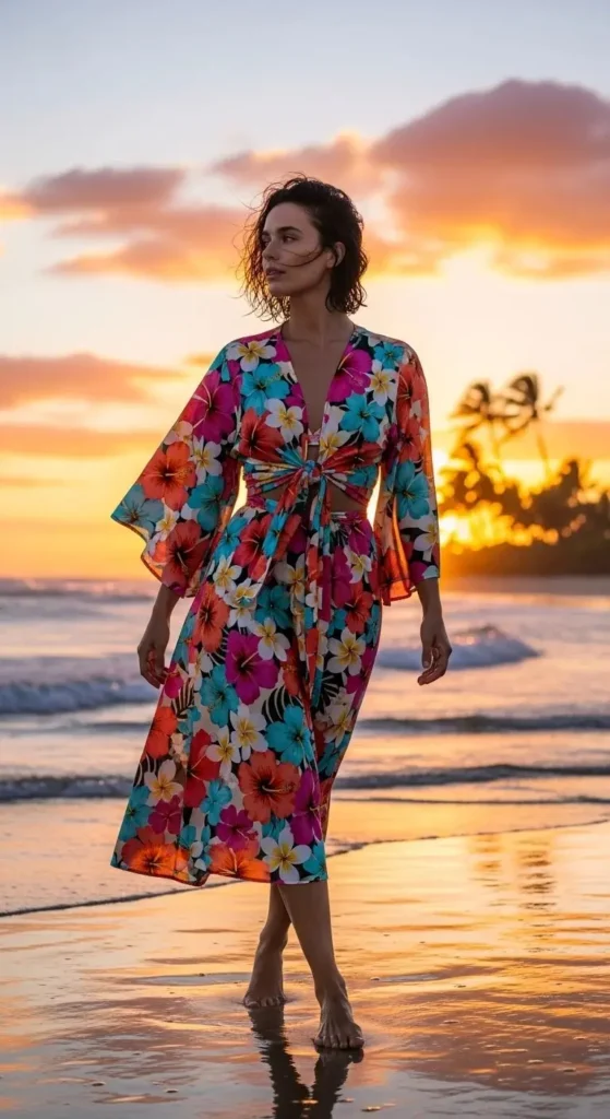 Tie-front kimono blouses offer the wide sleeves of a kimono with a fitted waist. Tying the fabric in front creates a beautiful, flattering drape. Seek out bold tropical prints for vacation outfits.