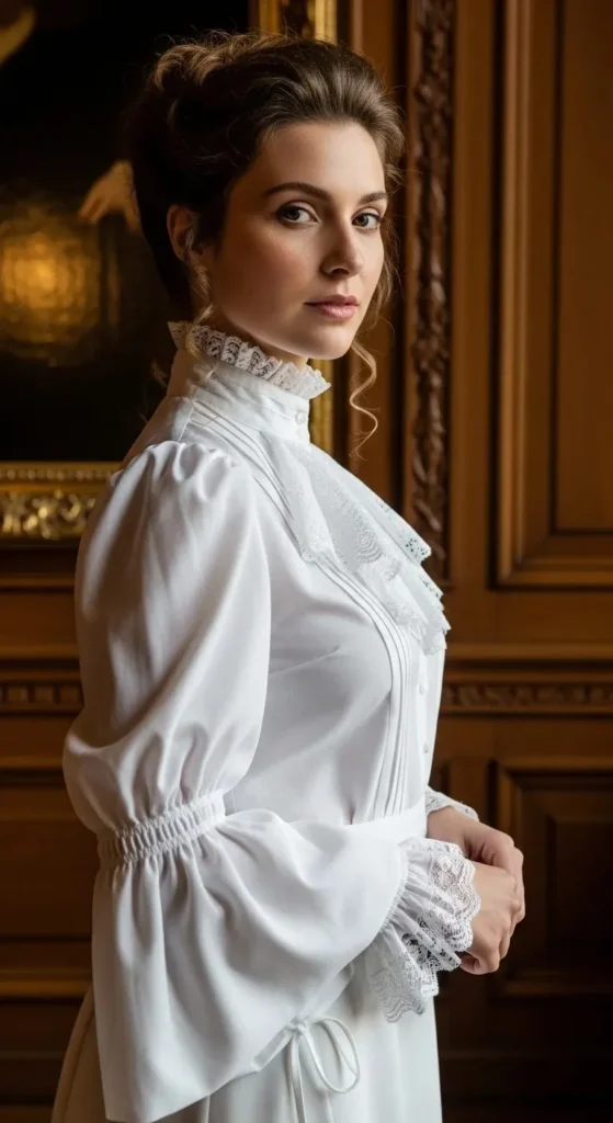 High-neck bishop blouses mix Victorian modesty with dramatic sleeve volume. This silhouette looks incredibly powerful and sophisticated. Choose crisp white cotton for a sharp, historical look.