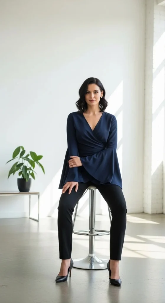 Wrap-around tops with bell sleeves offer the ultimate flattering fit. You control how tight the waist pulls, while the sleeves flow freely. Look for lightweight jersey materials that hug your curves.