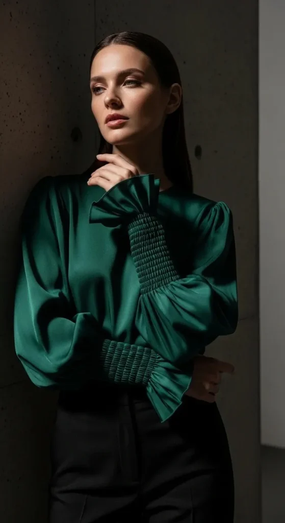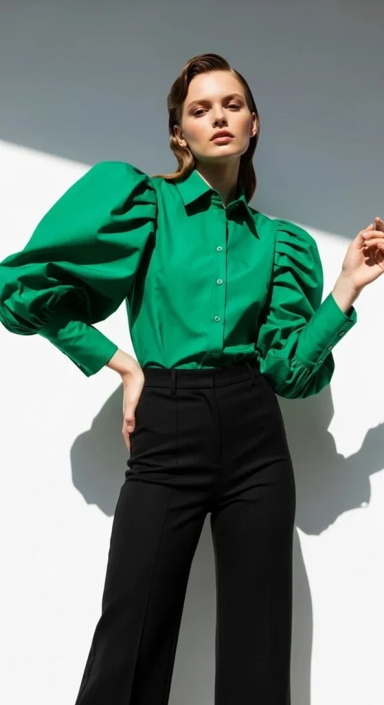 Pair a lantern sleeve top with tailored trousers. The sharp lines of the pants match the geometry of the sleeves. This makes a perfect work outfit.