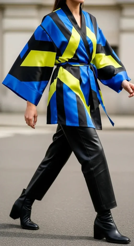 Kimono-inspired tops feature wide, straight sleeves that offer total comfort. The wrap design flatters almost every body shape. Look for bold patterns to make a strong visual statement.