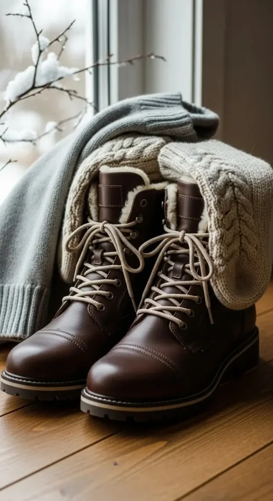 Look for rubber soles or textured bottoms to avoid slipping on icy days. Pair boots with wool socks or thermal tights for extra insulation.