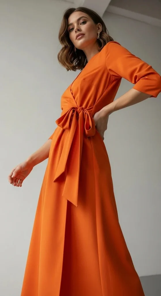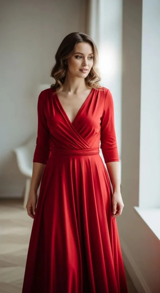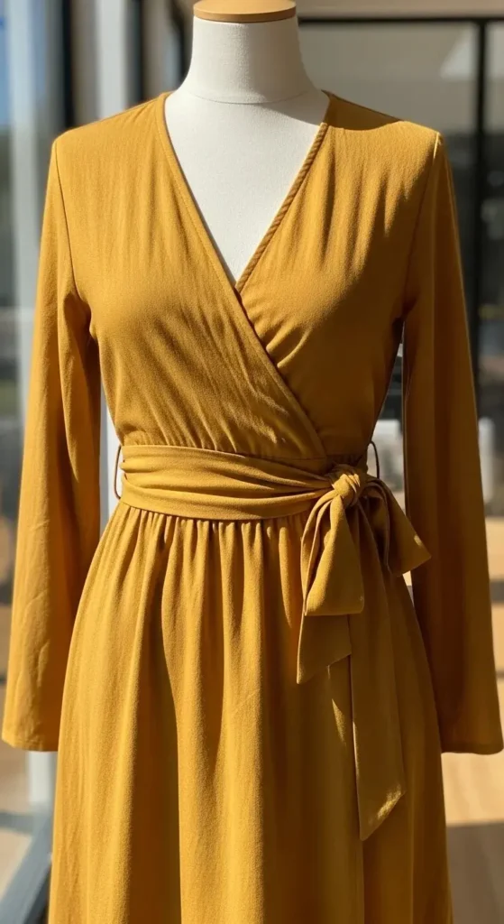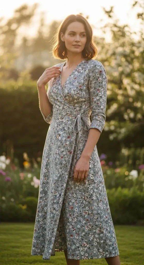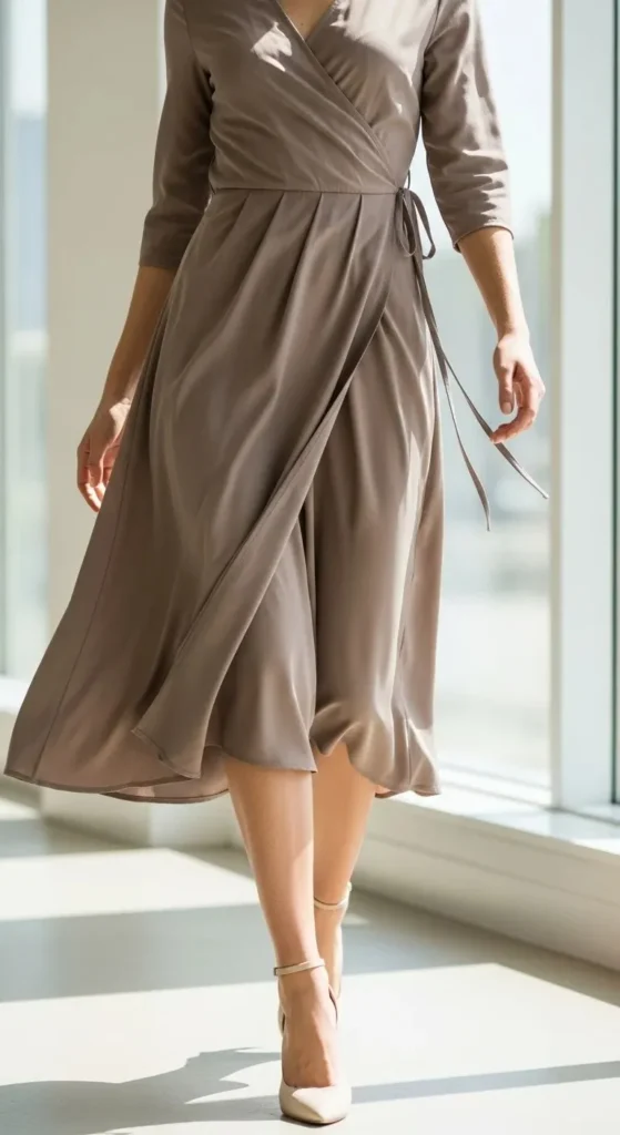 A midi wrap dress sits right in the middle of comfort and polish. The length feels balanced and works for many heights. Choose a fabric with slight weight so it drapes well without clinging. Budget tip: look for cotton blends instead of silk. They wash easily and last longer. Adjust the tie to highlight your waist comfortably. Pair with flats for daily wear or low heels for dinners. If the neckline feels low, add a snap stitch by hand. It takes five minutes and costs nothing. This dress works across seasons with simple layering.