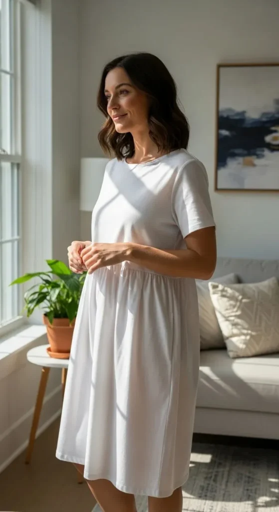 Side ties create a smooth front line. This style feels clean and simple. Budget tip: side ties are easy to adjust if weight changes. This dress works well for long wear days.